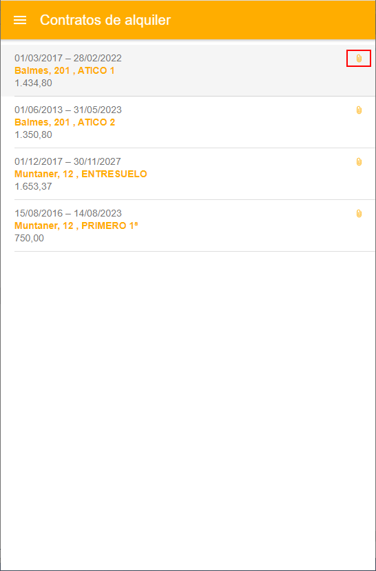 Si el contrato tiene uno o más documentos adjuntos, se muestra el dibujo del clip a derecha.