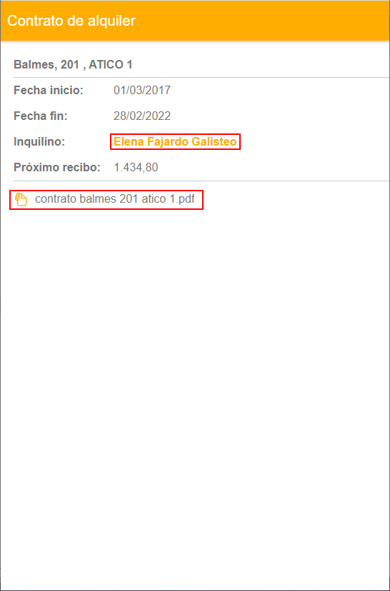Pulsando sobre uno de los contratos, se visualiza su ficha, mostrando sus datos y el inquilino asociado. Pulsando sobre el nombre del inquilino puede ver su ficha. Puede abrir cualquiera de los documentos adjuntos pulsando sobre él.