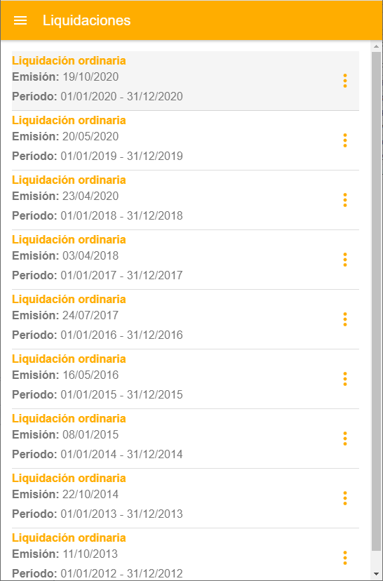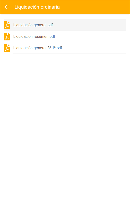 Pulsando sobre una de ellas, se muestran los documentos relacionados con dicha liquidación. Pulsando sobre ellos, se puede ver su contenido.