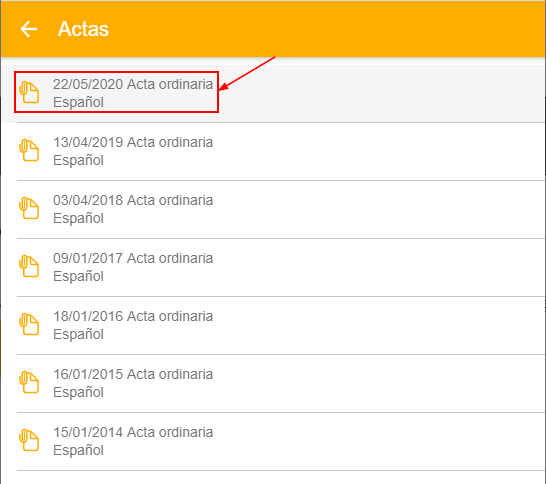 Esta opción se muestra sólo para las referencias de tipo comunidad o macrocomunidad. Pulsando sobre cualquiera de ellas se abrirá el documento correspondiente a esa acta, con la aplicación que tenga activada en su dispositivo.
