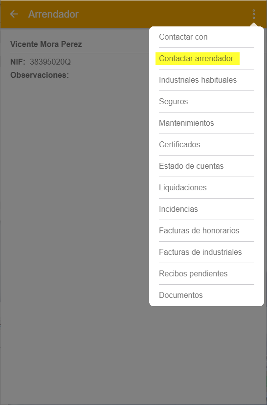 El menú de opciones es éste. Destacamos en amarillo las opciones que son exclusivas de arrendadores.