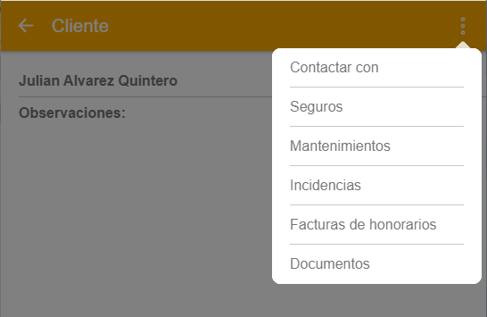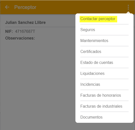 Desde la parte superior de la ficha de la referencia, puede abrir un menú de opciones relacionadas con ella. Estas opciones son sensiblemente diferentes dependiendo de si se trata de una comunidad o macrocomunidad de propietarios, un arrendador, un perceptor de reparto o un cliente.