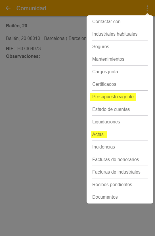 El menú de opciones es éste. Destacamos en amarillo las opciones que son exclusivas de comunidades y macrocomunidades.
