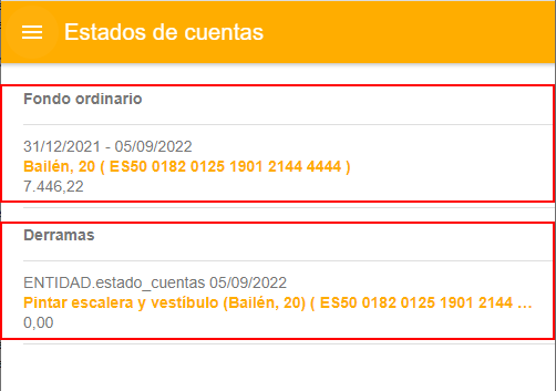 Se muestra una primera pantalla con la lista de cuentas disponibles para esa referencia. Para comunidades o macrocomunidades: ordinario, fondo de reserva, derramas. Para arrendadores todas sus hojas de liquidación.