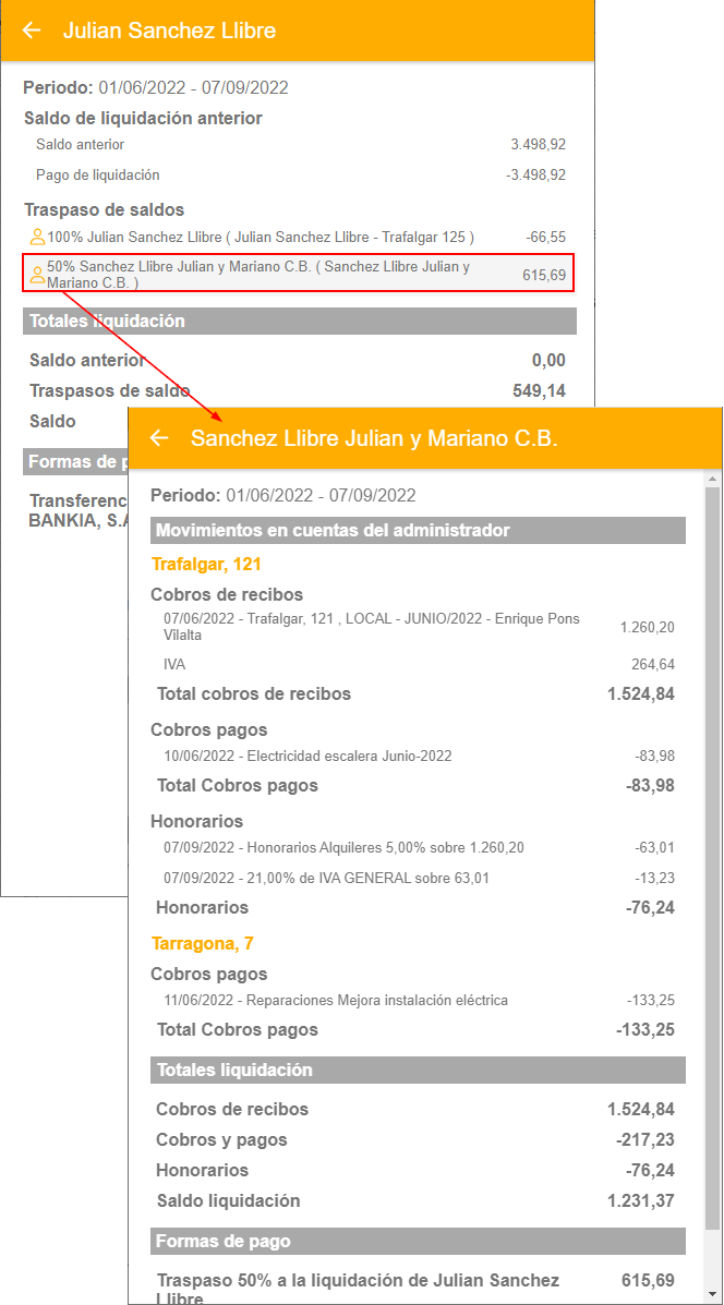 En el estado de cuentas de un perceptor de reparto, se identifican los repartos provenientes de las hojas de liquidación de las que participa. Haciendo clic sobre la línea, se puede consultar el estado de cuentas de esa hoja de liquidación.