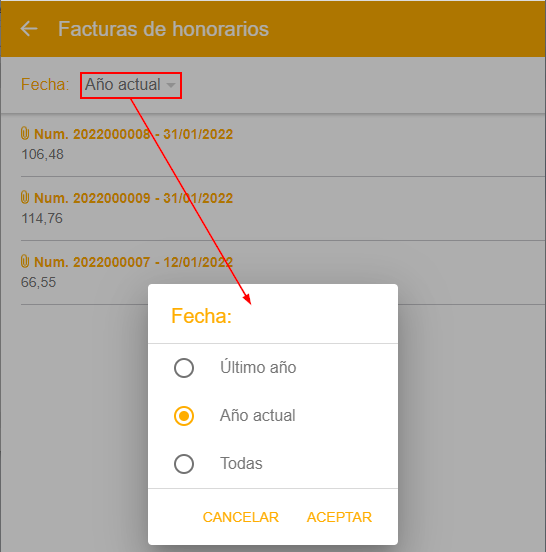 La parte superior de la lista permite filtrar las facturas a mostrar.