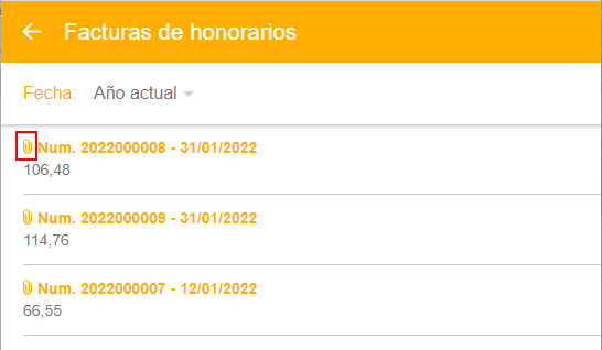 Todas las facturas emitidas tienen documento adjunto, indicándose mediante un clip a la izquierda del número de factura.