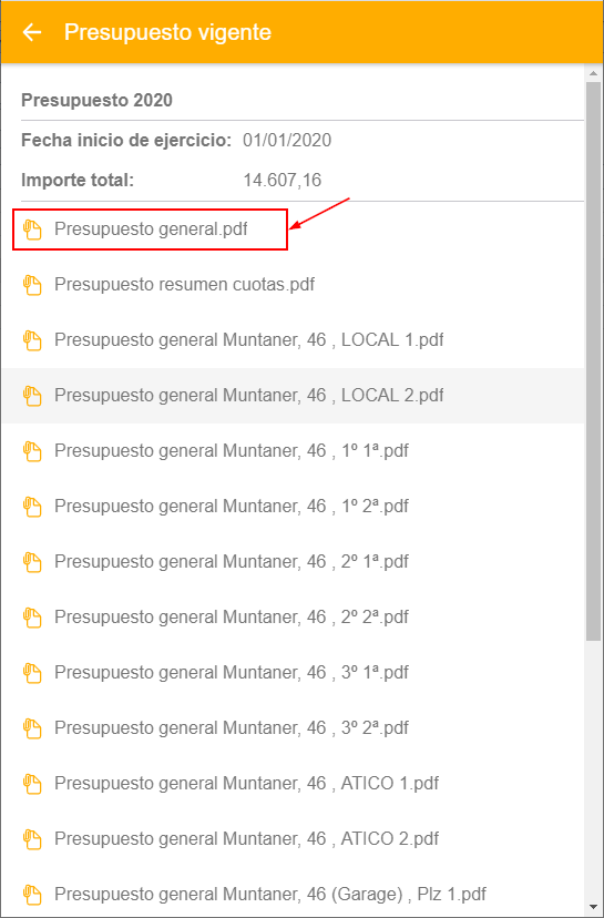 Esta opción se muestra sólo para las referencias de tipo comunidad o macrocomunidad. Se muestran los documentos generados por el presupuesto marcado como vigente. Pulsando sobre cualquiera de los documentos asociados, se abrirá con el visor que tenga activado en su dispositivo.