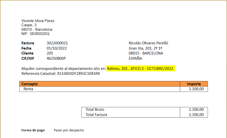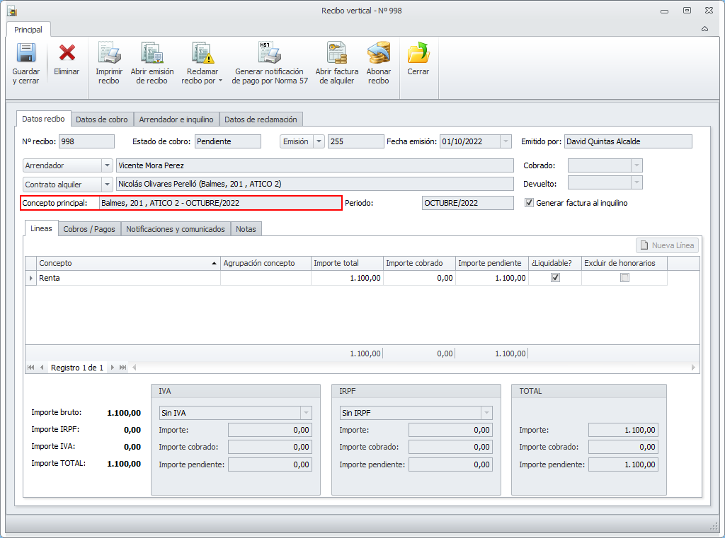 El recibo de alquiler dispone de una casilla llamada Concepto principal en el que se detalla el departamento alquilado y el mes/año de emisión.