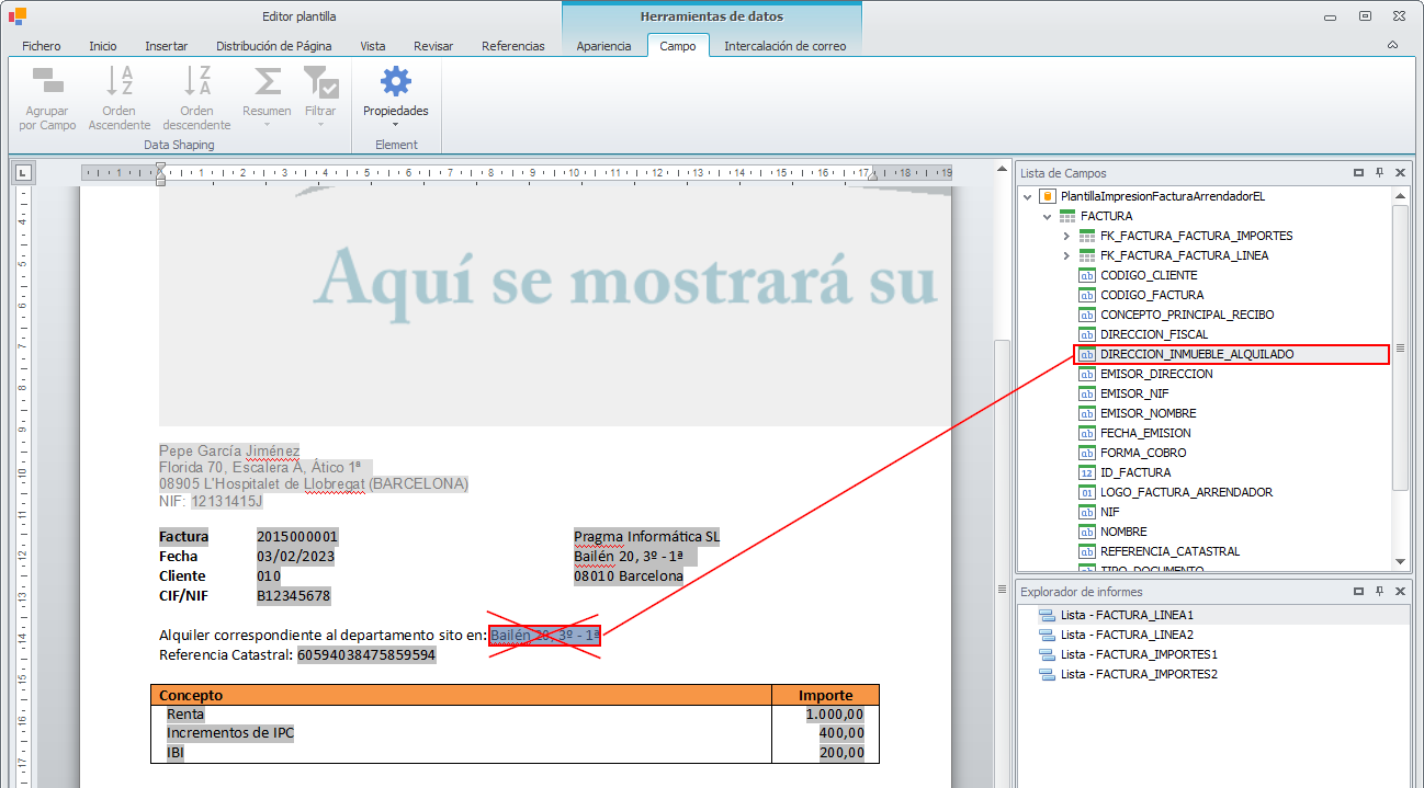 Para cada uno de los idiomas en los que se pueda imprimir la factura, debe editar la plantilla. En la siguiente imagen, puede ver el campo de combinación que corresponde a la dirección del inmueble alquilado.