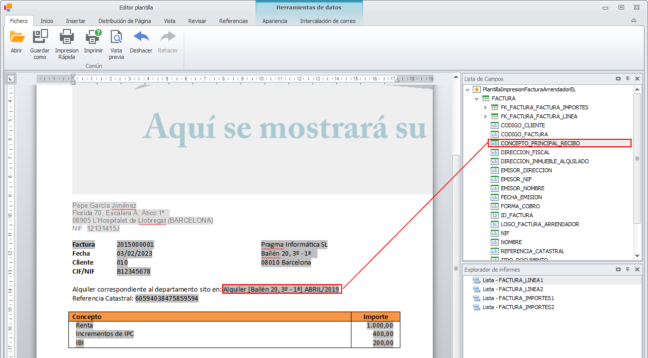 En su lugar añada el campo correspondiente al concepto principal del recibo, tal y como se muestra en la siguiente imagen.