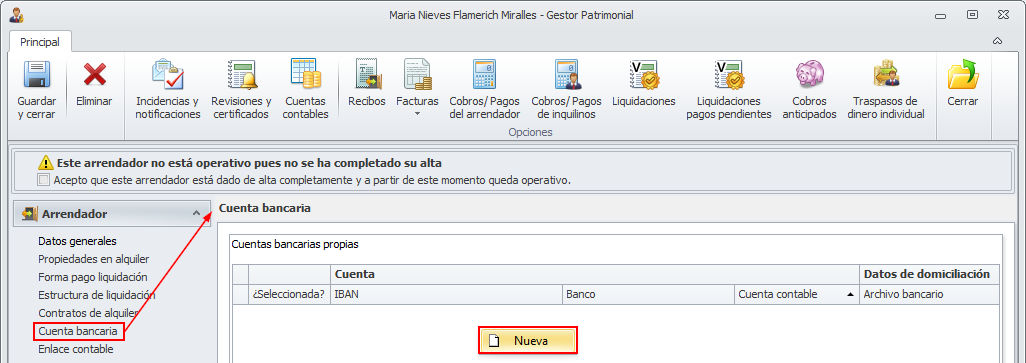 Acceda a la sección Cuenta bancaria. Haga clic en el espacio en blanco de la ventana y escoja Nueva.