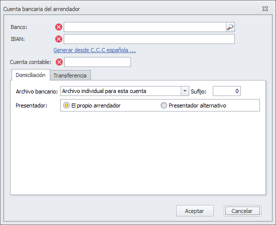 Aparece la siguiente ventana, en la que debe identificar los datos de la cuenta, incluyendo la cuenta contable de ese banco en la contabilidad del arrendador. Los demás parámetros se deben configurar como se configuran las demás cuentas bancarias.