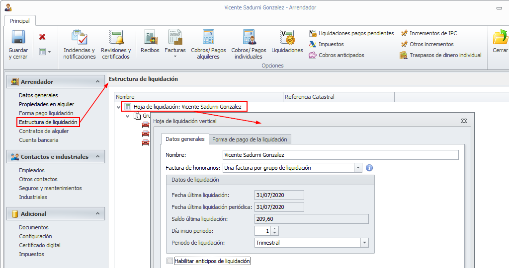 Para indicar que desea efectuar anticipos a un arrendador acceda a su ficha y sitúese en la sección Estructura de liquidación haciendo doble clic sobre la hoja de liquidación de la que desee realizar un anticipo.