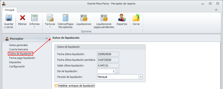 Para indicar que desea efectuar anticipos a un perceptor de reparto acceda a su ficha y sitúese en la sección Datos de liquidación.