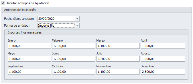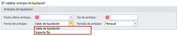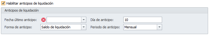 En ambos casos, haga clic en la casilla Habilitar anticipos de liquidación e indique el tipo de anticipo que desea efectuar.