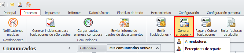 Los cuadros Anticipos por saldo de liquidación y Anticipos por importe fijo se muestran sólo si algún arrendador o perceptor tiene activado ese tipo de anticipo.