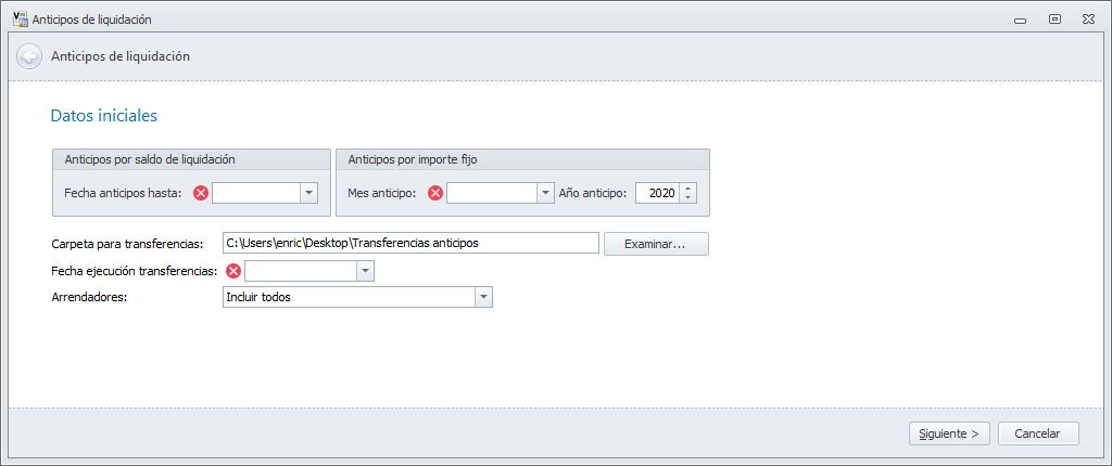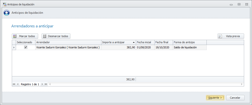 Se abrirá el asistente de anticipos de liquidación. Es el mismo en ambos casos, con la diferencia de que en el primero selecciona arrendadores y en el segundo perceptores de reparto.