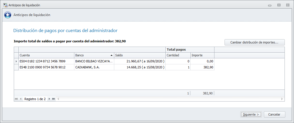 Si el administrador dispone de más de una cuenta bancaria, se muestra la ventana de distribución de importes. Haga clic aquí para obtener más información.