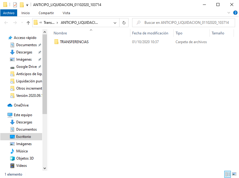 Al finalizar el proceso, se abre el explorador de archivos mostrando la carpeta que contiene los archivos de transferencia. Recuerde remitirlos a su banca electrónica.