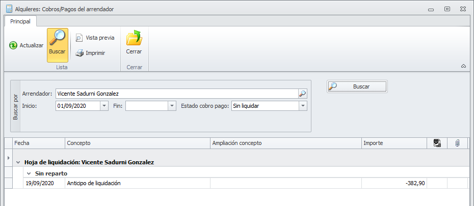 En la siguiente ventana se localizan los arrendadores o perceptores que deben recibir el anticipo, según estas condiciones: