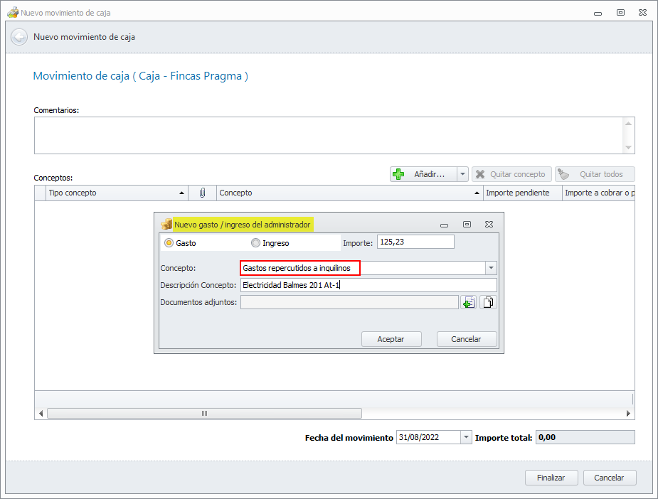 Normalmente se realizará desde un apunte bancario, pero también puede ser desde un movimiento de caja. Se debe registrar como un gasto del administrador, sin factura. Es importante definir un concepto del administrador expresamente para el pago de gastos por cuenta de los inquilinos y usar siempre el mismo.