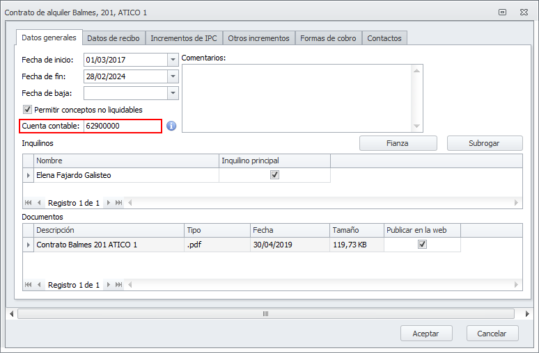 Debe accederse a la ficha del contrato de alquiler y añadir una línea de concepto de recibo. Haga clic aquí para ver cómo.