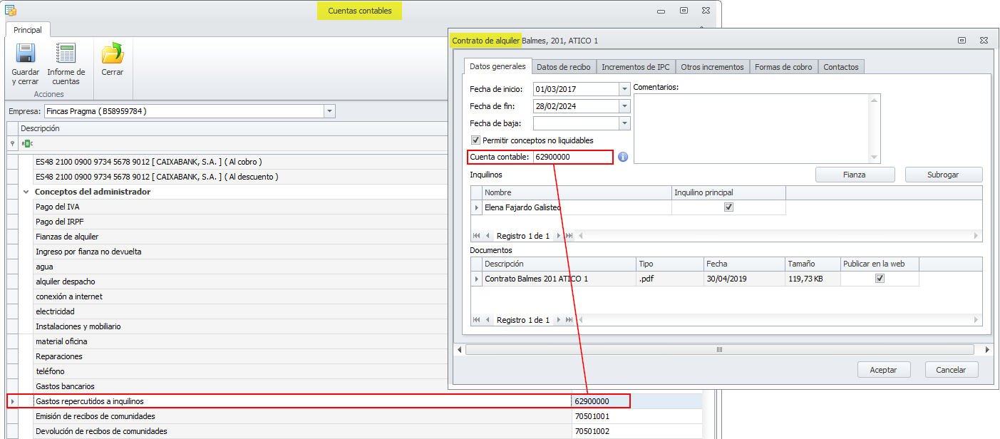 Usando este método y teniendo en cuenta que lo más habitual es registrar el gasto del administrador en una misma cuenta para todos los gastos por cuenta de inquilinos, se debería usar esa misma como cuenta contable de conceptos no liquidables para todos los inquilinos. De este modo, la contabilidad mostrará en esta cuenta el importe de la deuda de los inquilinos por conceptos no liquidables.