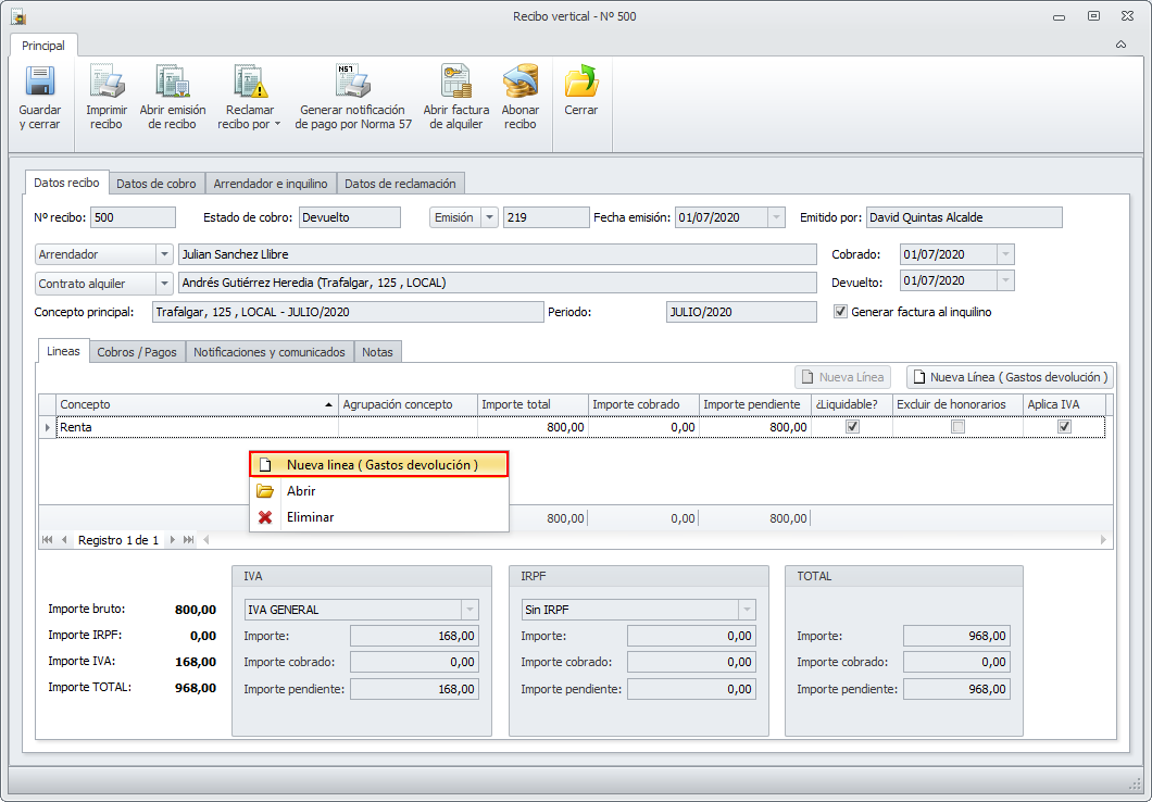 Al dar de alta un recibo devuelto de forma manual, el programa permite entrar una línea de recibo asociada a los gastos de devolución.