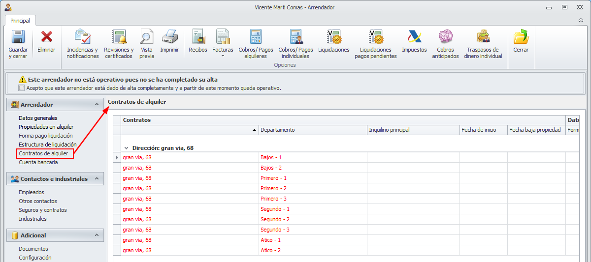 La vista de los contratos de alquiler del arrendador tiene el siguiente aspecto. Se detallan las propiedades en alquiler agrupadas por direcciones. En cada propiedad se muestra la información correspondiente al contrato de alquiler en vigor. Si alguna propiedad no tiene ningún contrato de alquiler en vigor se muestra la línea en color rojo.