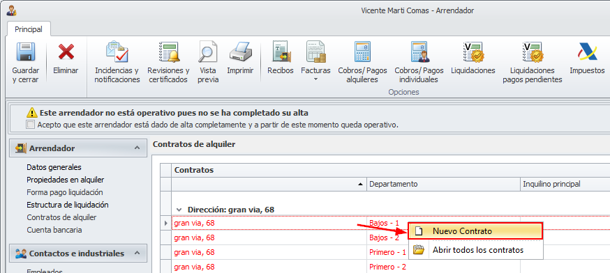 Inquilinos: Con botón derecho y Nuevo, añada a tantos inquilinos como compongan el contrato de alquiler. Recuerde que debe activar en alguno la casilla Inquilino principal.