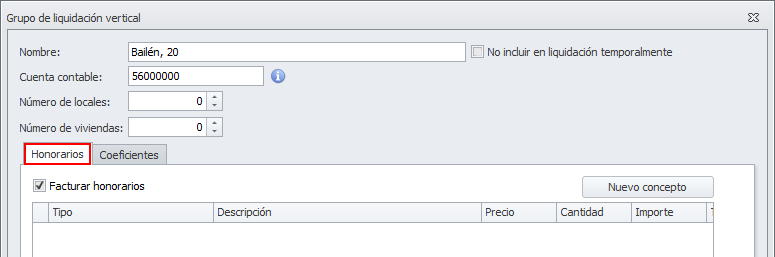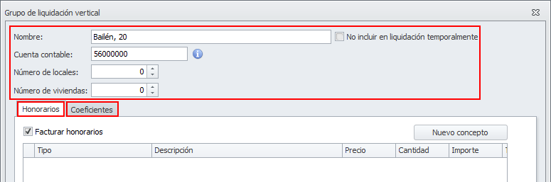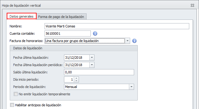 El grupo de liquidación dispone de unos datos generales, distribuyendo el resto de datos entre dos pestañas, Honorarios y Coeficientes.