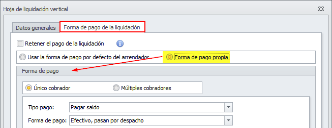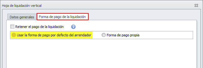 En la pestaña Forma de pago de la liquidación encontrará activada la casilla Usar la forma de pago por defecto del arrendador.