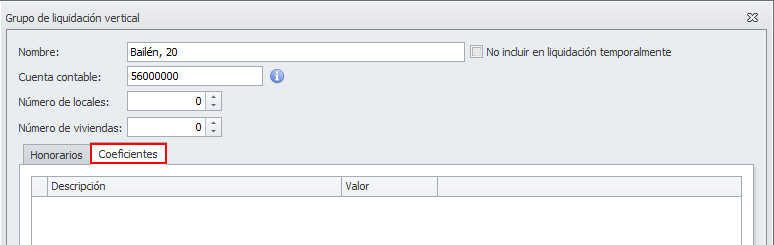 En la pestaña Coeficientes se podrá, si es necesario, introducir coeficientes de reparto.