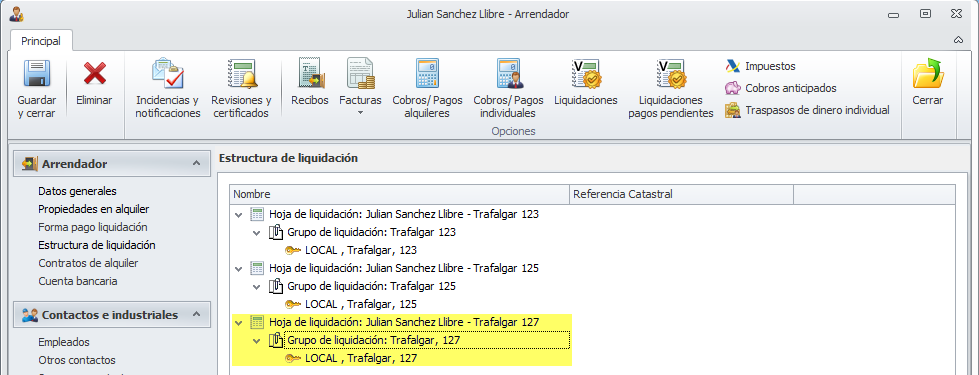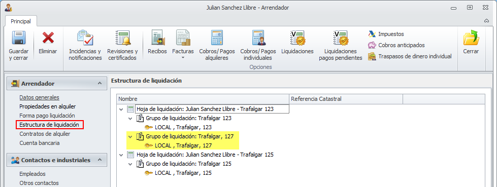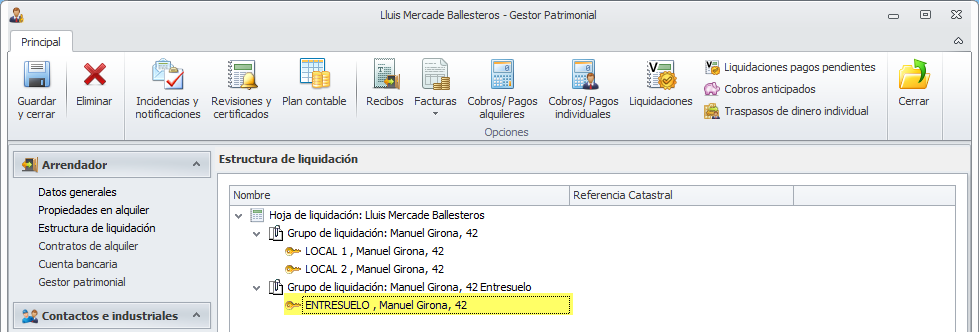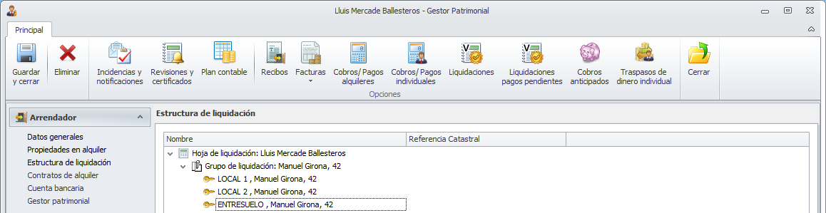 Se pueden ver los datos anidados de tal forma que, en un primer nivel, se muestra el nombre del arrendador en lo que se denomina hoja de liquidación. Un arrendador puede tener una o varias hojas de liquidación.
