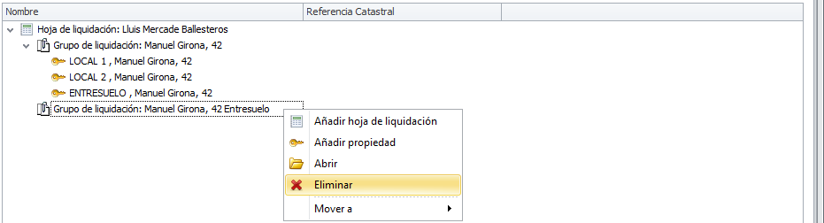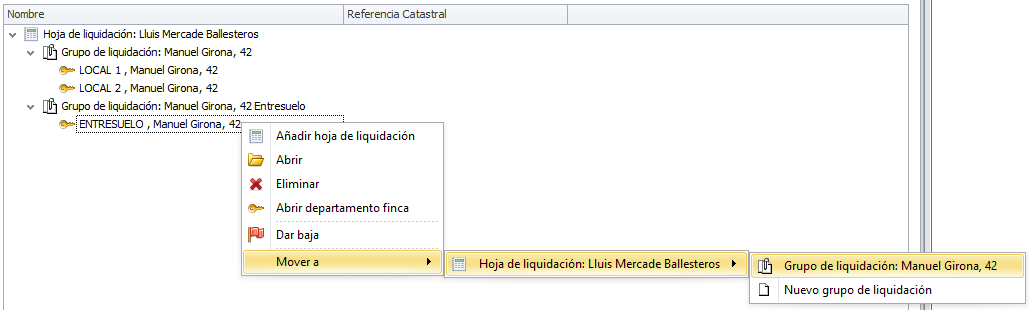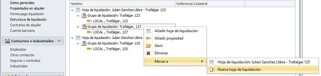 La modificación de la estructura se realiza haciendo clic derecho sobre el elemento a cambiar. En este ejemplo se emite una hoja de liquidación por cada propiedad. Para mantener el mismo criterio, se escogerá la opción Mover a y Nueva hoja de liquidación.