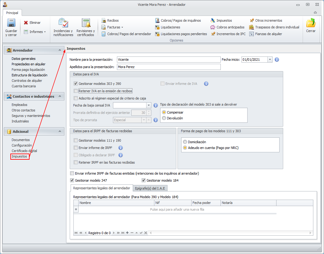 En la ficha del arrendador puede determinar qué impuestos le gestiona.
