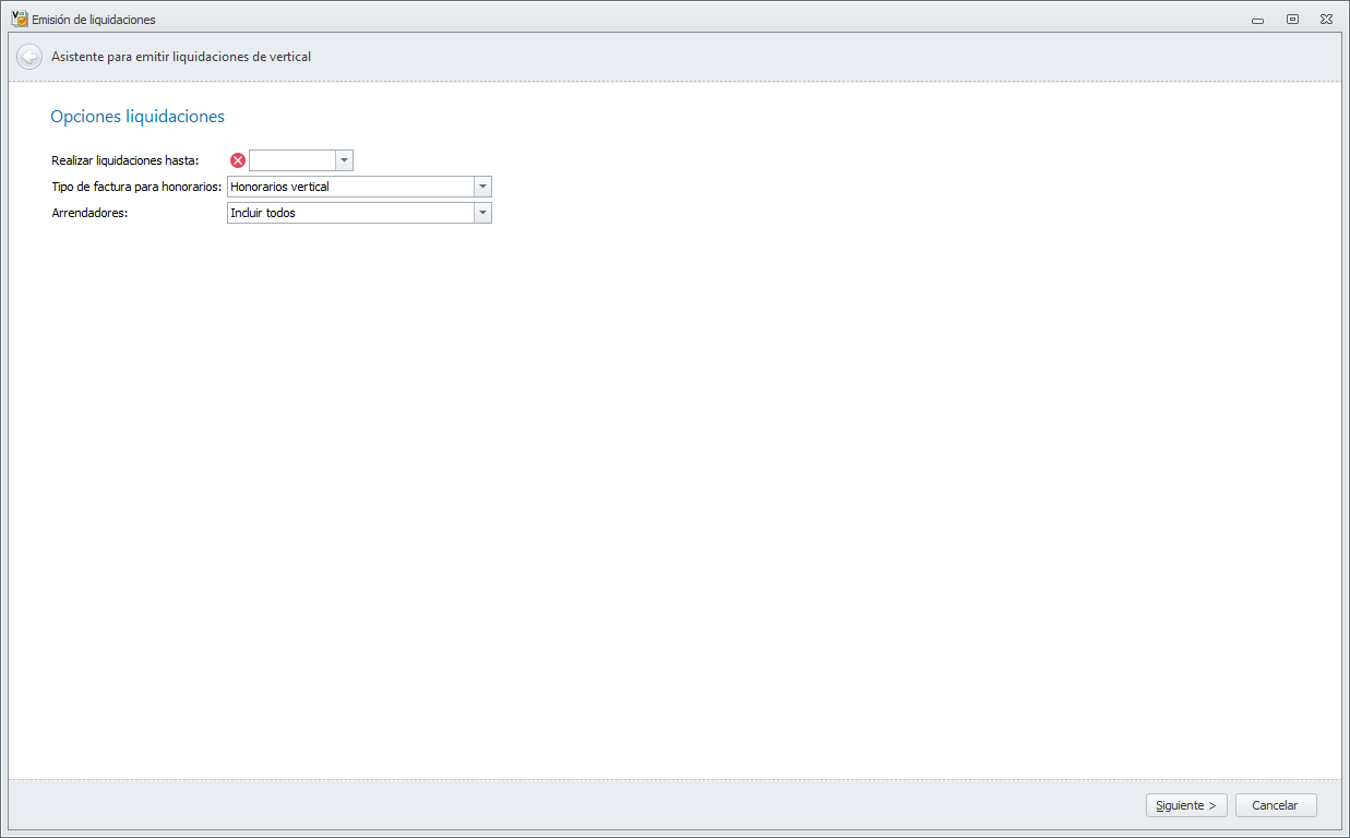 La primera ventana del asistente de emisión de liquidaciones tiene el siguiente aspecto.