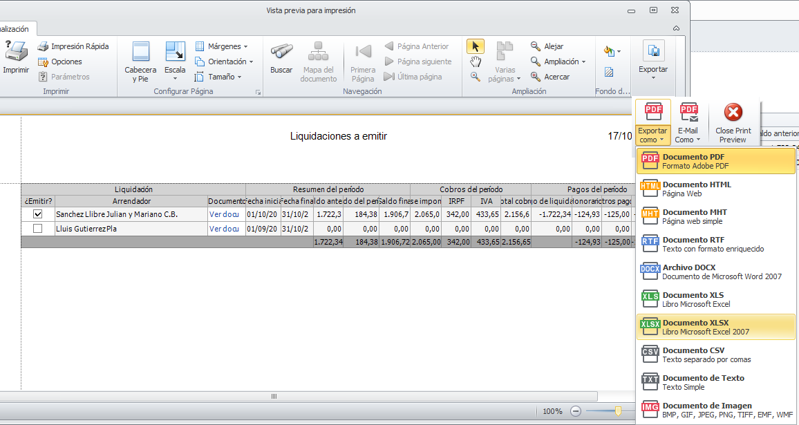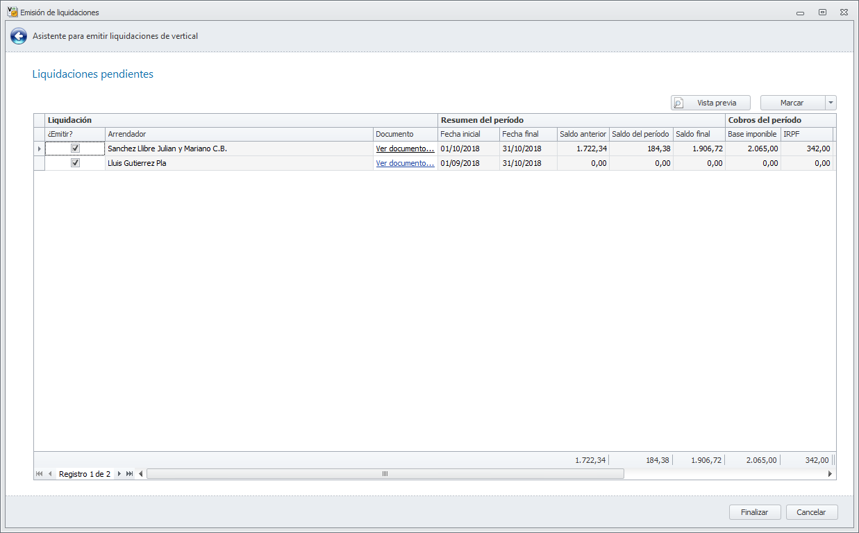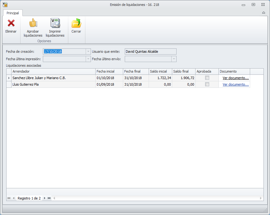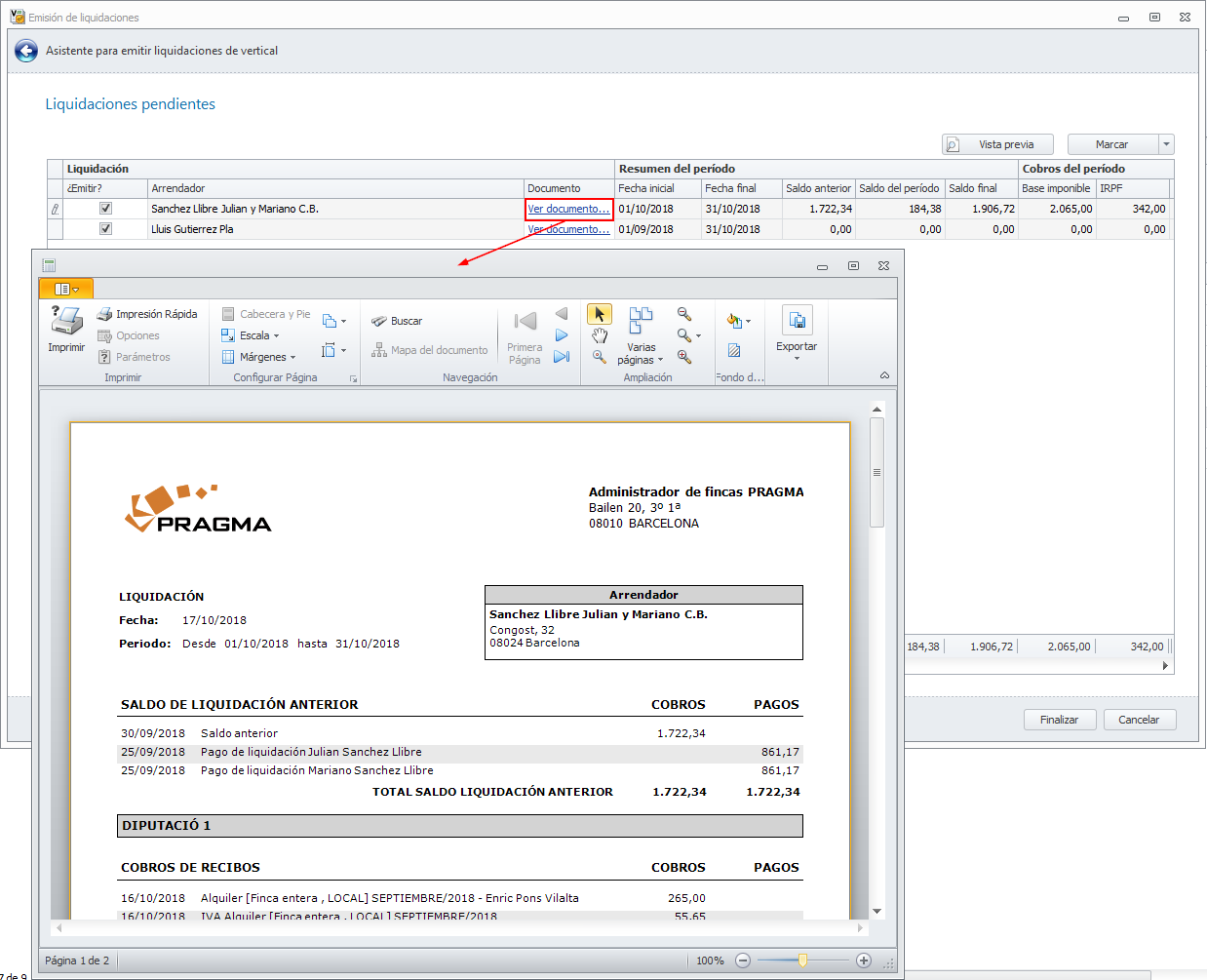 En la lista puede ver, además del nombre del arrendador, las fechas de inicio y final de liquidación, el saldo anterior y el saldo final, además de otros datos. Si hace clic en Ver documento, se mostrará la liquidación para que la pueda revisar.