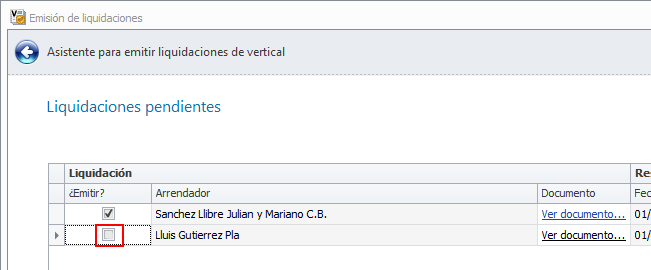 Si en este momento desea excluir alguna liquidación, desmarque la casilla Emitir. Si continúa con el proceso esa liquidación no se emitirá.