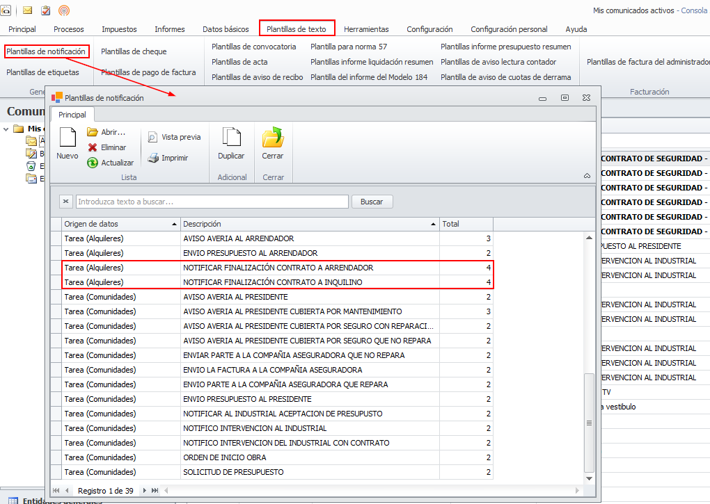 Si no dispone de plantillas para notificar la finalización de contrato al arrendador y al inquilino, puede crearlas accediendo al menú Plantillas de texto y Plantillas de notificación.