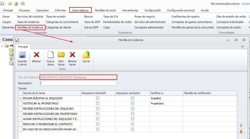 Si ha creado las plantillas de notificación propuestas en el punto anterior, es aconsejable dejarlas configuradas en la plantilla de incidencia que se usa para gestionar la revisión. La encontrará accediendo a la opción Plantillas de incidencia del menú Datos básicos.