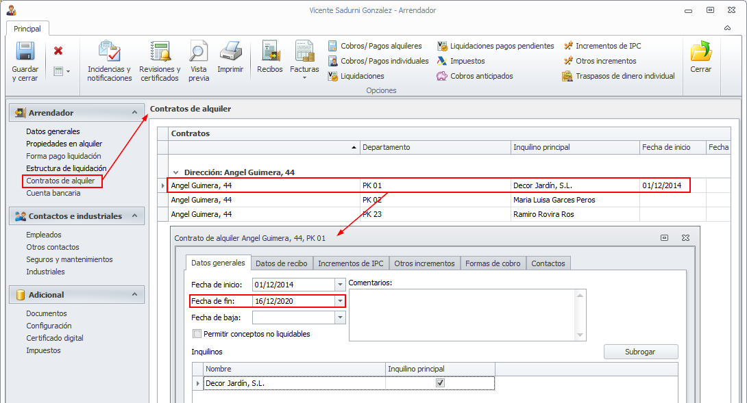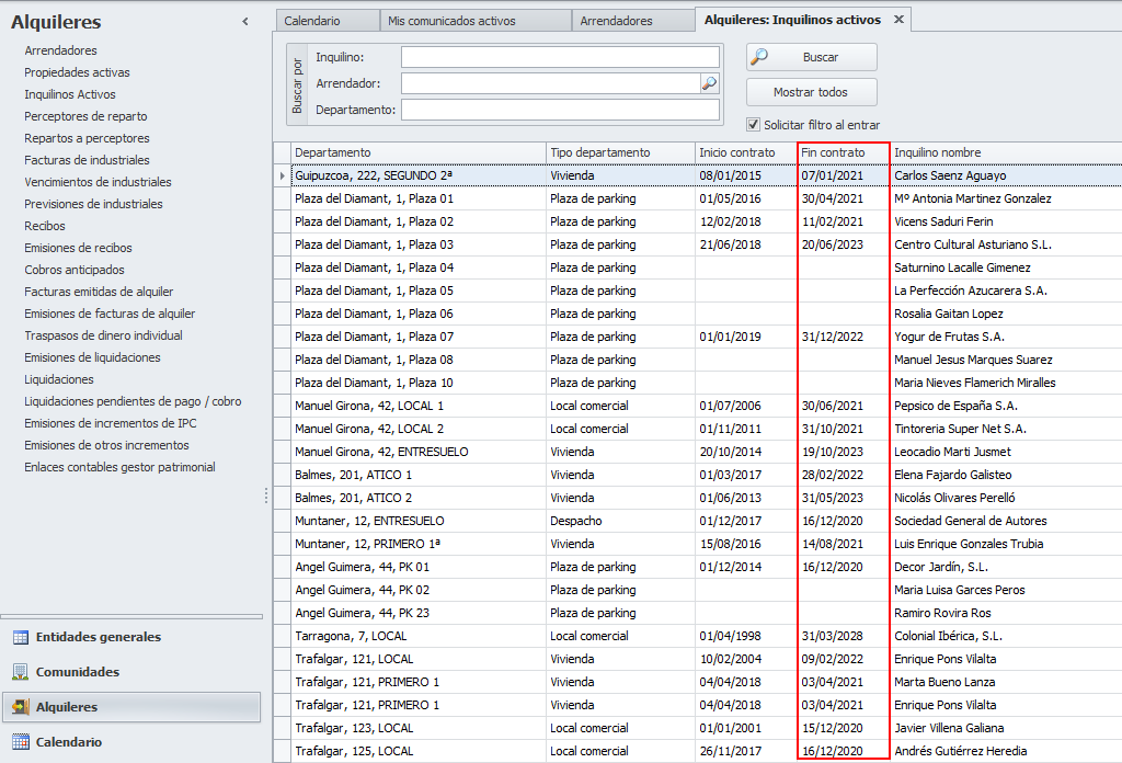 El procedimiento de control de vencimientos de contrato se basan en la fecha de finalización de contrato indicado en la ficha de los contratos de alquiler.