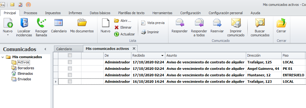 Adminet ofrece un procedimiento de avisos de vencimiento de contratos de alquiler, consistente en el envío de comunicados a los usuarios escogidos y la gestión del seguimiento a través del circuito de incidencias.