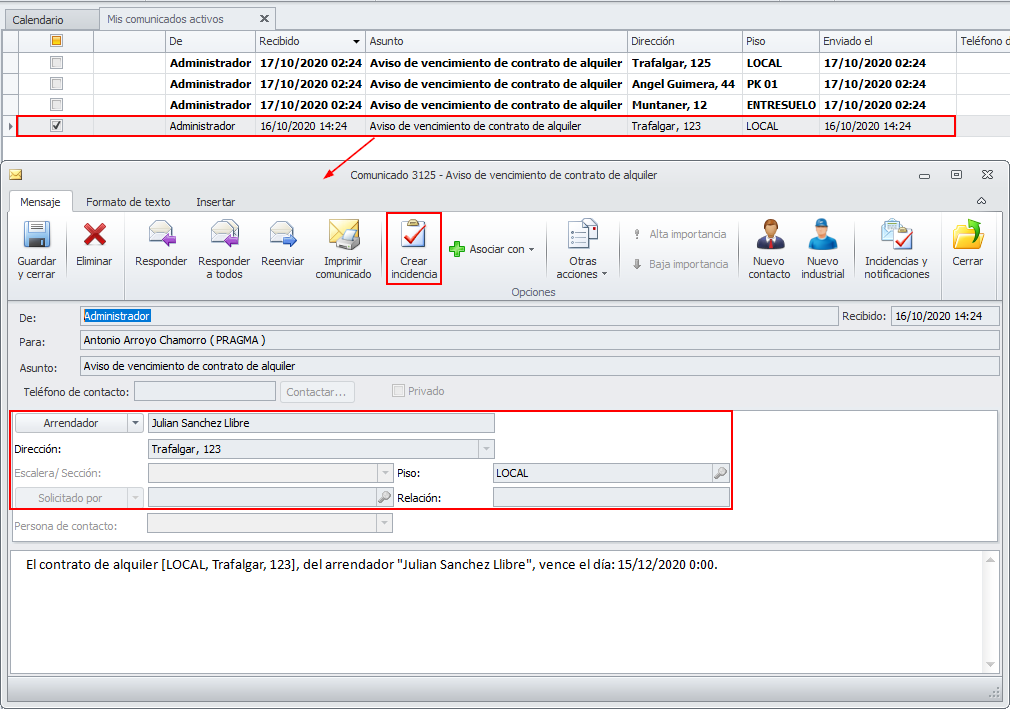 Abra el comunicado. Puede ver el departamento al que hace referencia y el arrendador al que pertenece. Haga clic en el botón Crear incidencia.