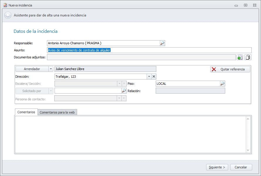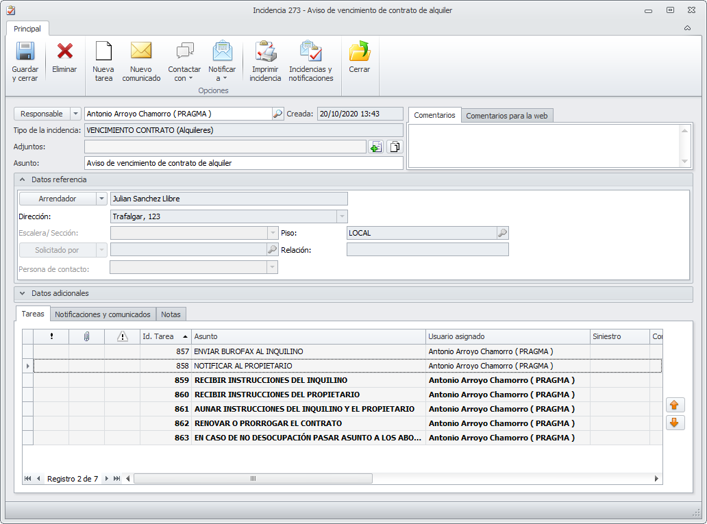 Si bien la configuración de los avisos es el protocolo mínimo recomendado para el control de los vencimientos de contrato, aconsejamos implementar el proceso completo, ya que aporta rapidez y trazabilidad en la gestión de las notificaciones y control sobre el estado de una revisión de contrato. Durante el proceso de revisión y una vez finalizado, desde la incidencia se pueden consultar las gestiones realizadas y toda la correspondencia emitida y recibida relacionada con este asunto.