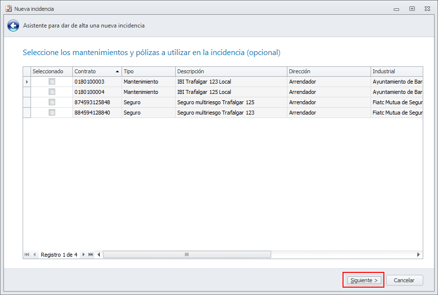 La siguiente ventana del asistente le muestra los mantenimientos y pólizas del arrendador. No seleccione ninguno y haga clic en Siguiente.