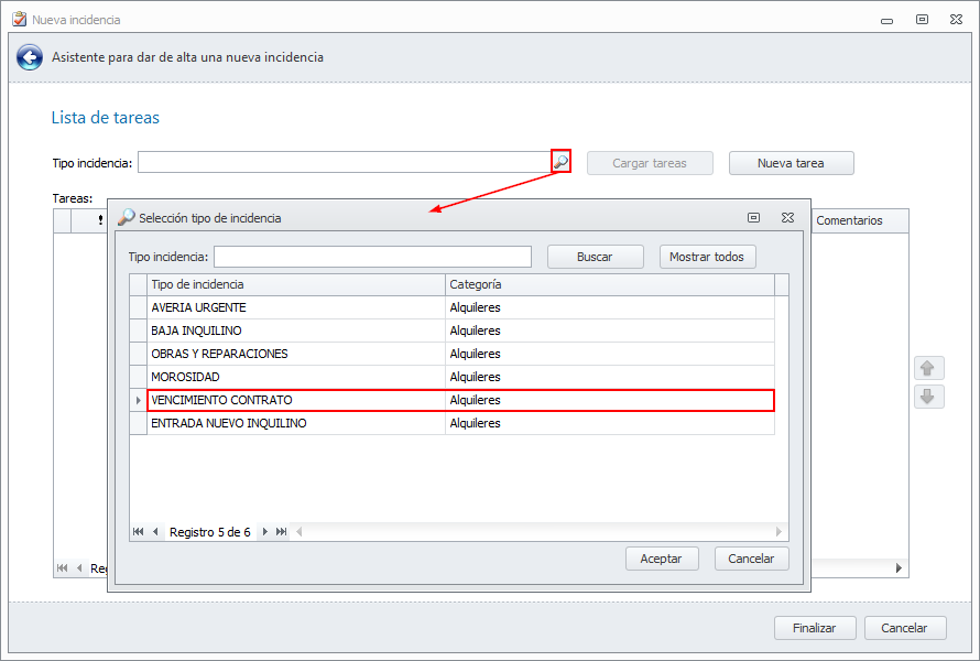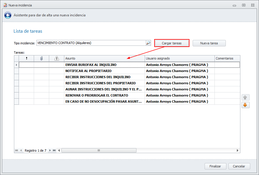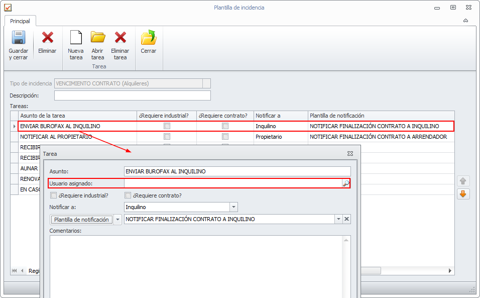 Tanto estas tareas como las demás que constan en la plantilla son una propuesta de trabajo, que usted puede adaptar a los protocolos establecidos en su despacho, quitando, añadiendo o modificando estas tareas. También puede personalizar dentro de cada tarea cual será el usuario encargado de realizarla. Si deja el usuario vacío se asignará dicha tarea al usuario que genere la incidencia.