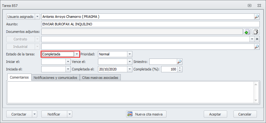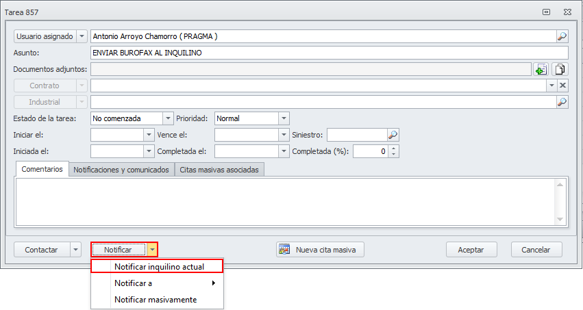 Para notificar la finalización de contrato al inquilino, abra la tarea Enviar burofax al inquilino. Haga clic en el botón Notificar y escoja Notificar inquilino actual.