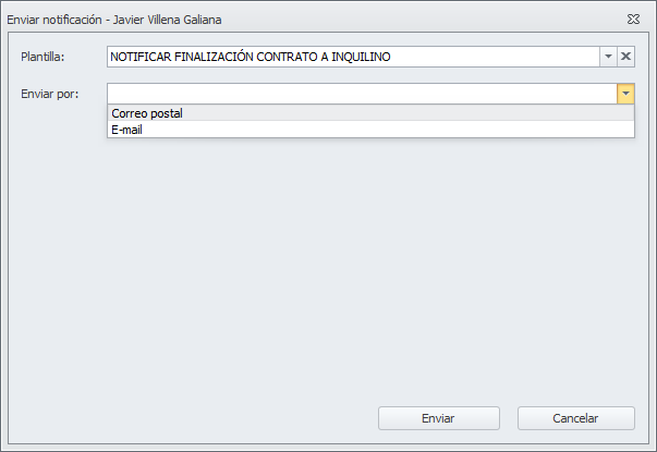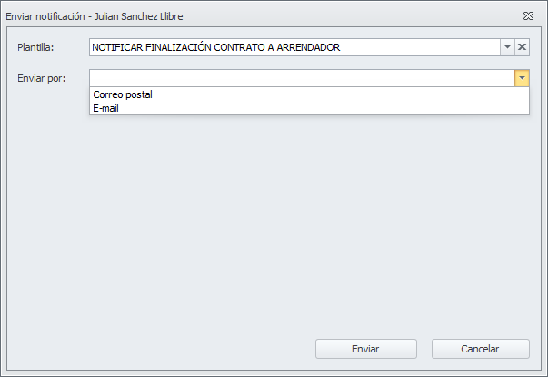 El programa mostrará la plantilla de notificación, cuya creación se explica en el apartado Configuración de este mismo documento. Escoja el medio de comunicación que desea (correo postal o e-mail) y haga clic en Enviar. Se solicitarán los datos necesarios para completar el envío según el medio escogido.